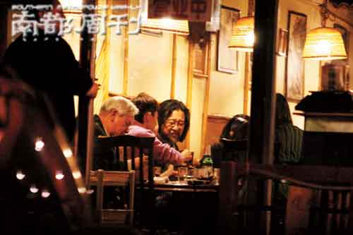 4月5日,話劇《暗戀桃花源》在保利劇院的最后一場(chǎng)演出結(jié)束后,導(dǎo)演賴聲川、主演黃磊孫莉夫婦和何炅、喻恩泰等一行人來(lái)到了簋街附近的一家火鍋店消夜,席間氣氛非常熱烈。記者看到在當(dāng)天的飯席上除了孫莉和另一位女演員外,還有一位氣質(zhì)不俗、妝容精致的中年女性坐在賴聲川的身旁,酒席上的明星大腕們對(duì)這位女性看上去非常尊重,每當(dāng)她講話時(shí),眾人都認(rèn)真傾聽(tīng),不住點(diǎn)頭,顯示出她在“桃花源”劇組中的分量不輕。后來(lái)記者得知當(dāng)天那位儀表端莊文雅的女性正是賴聲川甘居幕后的妻子丁乃竺。怪不得當(dāng)天晚上,黃磊等大腕們對(duì)那位女性恭敬有加,原來(lái)是“老板娘”親自來(lái)慰問(wèn)勞軍了。也許因?yàn)樘吲d,兩次出門(mén)接打電話的何炅手舞足蹈,肩斜腰軟,舉止活像搞怪的小姑娘。再加上他穿著粉紅色連帽衫,背著黑色時(shí)髦大包,還真容易誤認(rèn)為是女孩兒。