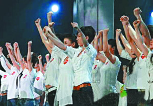 募捐晚會(huì)現(xiàn)場(chǎng),眾星齊唱《愛的奉獻(xiàn)》。 圖/央視國(guó)際
