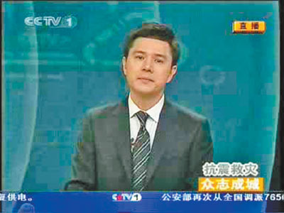 “為什么我們總是被這樣的聲音,這樣的畫面感動,為什么我們總是看著看著就會眼含熱淚,”5月14日中午,趙普在主持央視“眾志成城 抗震救災”地震直播節(jié)目,當看到前方記者發(fā)回的報道畫面后,趙普禁不住哽咽了。觀眾可以明顯地看到,趙普的眼眶濕潤了,為此他不得不低頭調(diào)整一下情緒。