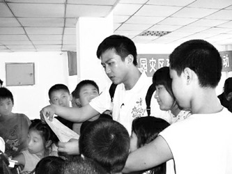鄧超一來到武侯區(qū)愛心家園,馬上就被孩子們圍住了。鄧超問:“你們會唱什么歌?”幾十個孩子齊刷刷地響亮回答:“《感恩的心》!”當孩子們不約而同地唱響此歌時,鄧超也跟著唱了起來,他懷里緊緊抱著一個孩子,眼里閃著淚花。來自映秀鎮(zhèn)的13歲女孩陳兆鮮昨天非常高興,因為鄧超帶著大家高聲朗讀了她寫下的幾句話:“我高興,因為我們得到了好心人的幫助!我快樂,因為暴風雨過后又看到了美麗的彩虹……”