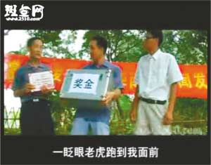 事隔4個(gè)多月后,近日“周老虎”還原真相成了紙老虎。隨后記者在斑點(diǎn)網(wǎng)等視頻網(wǎng)站上看到,從6月30日開始,全長(zhǎng)27分47秒的視頻小電影《拍虎》也被傳到網(wǎng)上,片中周正龍被稱為“周震聾”,因?yàn)榱謽I(yè)局張局長(zhǎng)承諾“如果當(dāng)?shù)卮迕裨谖覀兛疾礻?duì)進(jìn)山之前能發(fā)現(xiàn)華南虎,我們會(huì)給一箱錢作為獎(jiǎng)勵(lì)”,于是“周震聾”十分興奮,上山尋虎十幾天,最后與人密謀通過年畫拍出華南虎照片。全片最后表現(xiàn)“周震聾”在事情敗露后,從山崖摔下導(dǎo)致失憶,人也變得瘋瘋癲癲,成天抱著個(gè)假老虎模型唉聲嘆氣。