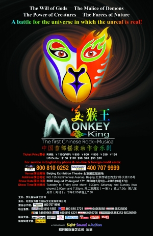 定位為搖滾動(dòng)作音樂劇,又要與中國(guó)傳統(tǒng)音樂元素相結(jié)合,羅啟仁說到音樂上的特點(diǎn)很興奮:“《美猴王》的音樂創(chuàng)作者周佼佼很年輕,作為奧運(yùn)會(huì)期間首演的大劇用一位學(xué)生級(jí)的作曲,很多人不能認(rèn)同。我不認(rèn)為年輕不行,我有我的勇氣。因?yàn)閾u滾是年輕人的范圍,如果找一位很大年紀(jì)的人來弄搖滾,是‘搖’不出來的。音樂是中國(guó)類型的搖滾,是特別新鮮的,西方都沒有這類的作品。吉他和琵琶的二重奏、與古箏的二重奏等,還有美聲的唱法,大概十首歌,聽起來很不錯(cuò)!