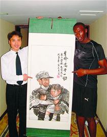 牙買加飛人博爾特在奧運(yùn)會(huì)百米決賽中以9秒69震驚世界,昨日記者獲悉,博爾特與山東濟(jì)寧的一位農(nóng)民畫家還有一段小故事——— 奧運(yùn)開幕前夕,博爾特隨牙買加體育代表團(tuán)在天津訓(xùn)練時(shí),濟(jì)寧畫家房貽德特意托人向博爾特贈(zèng)送了一幅抗震救災(zāi)題材國(guó)畫,博爾特欣然接受,并回贈(zèng)了一件他的簽名運(yùn)動(dòng)服。