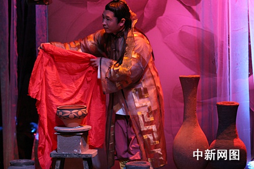 該劇是以發(fā)生在澠池仰韶村一個(gè)陶藝世家的制陶故事為背景,通過(guò)秦王的兒子邂逅彩陶女所產(chǎn)生的愛(ài)情故事為主線,整個(gè)劇情起伏跌宕,臺(tái)詞風(fēng)趣幽默,令觀眾沉醉在悲喜交加的人物命運(yùn)中。影視戲劇演員張成曉勇的精彩演繹博得了全場(chǎng)觀眾的陣陣掌聲和喝彩。當(dāng)絢麗的舞臺(tái)燈光變幻出滿場(chǎng)旋轉(zhuǎn)的來(lái)自澠池縣仰韶村彩陶坊的精美彩陶時(shí),把整個(gè)劇情推向了高潮,令在場(chǎng)的首都觀眾驚嘆不已。樸拙俊美的仰韶彩陶的確是在金黃的季節(jié)里給首都的觀眾上了一道視覺(jué)文化大餐。