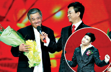 趙本山和小沈陽的春晚小品《不差錢》,昨晚捧得了小品類觀眾最喜愛的節(jié)目一等獎(jiǎng),趙本山在得獎(jiǎng)感言時(shí)表示:“我最興奮的是,我兩個(gè)學(xué)生終于能站在這個(gè)舞臺上了,這讓我非常高興!毕噍^之下,倒是小沈陽的得獎(jiǎng)感言很是簡單,只有“感覺很美”四個(gè)字。按照慣例,獲獎(jiǎng)嘉賓要表演節(jié)目,而趙本山今年首次坐鎮(zhèn)觀眾席,讓徒弟小沈陽獨(dú)自撐場面,“咱們這幾個(gè)誰來都容易被哄下臺去,還是小沈陽來吧!庇谑,小沈陽獻(xiàn)唱了拿手曲目《大!罚褟堄晟穆曇裟7碌梦┟钗┬,贏得觀眾陣陣掌聲。一曲唱罷,下臺前還摔了一跤,觀眾們頓時(shí)笑翻。而董卿立即上臺給他圓場:“小沈陽是在逗咱們,其實(shí)他到哪表演都摔。”