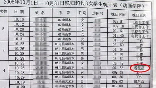 近日,北影校園內(nèi)張榜公布了各系晚歸同學(xué)的名單,把超過3次晚歸的學(xué)生和詳細(xì)原因都公布了出來。在網(wǎng)友上傳的晚歸名單中,晚歸的理由有“電視臺工作”、 “吃飯”、“回家”、“拍戲”等,最讓網(wǎng)友意外的是有一名同學(xué)的晚歸理由是“看星星”。根據(jù)網(wǎng)友上傳的這份晚歸名單,“看星星”的這名女同學(xué)在2008年 10月26日晚第四次晚歸,接近凌晨1點(diǎn)才回宿舍。