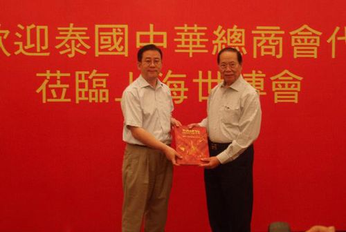 當(dāng)晚,泰國中華總商會(huì)在下榻賓館舉行晚宴,該會(huì)主席吳宏豐代表全體客人向國務(wù)院僑辦、上海市僑辦、上海世博局等給予他們的優(yōu)厚禮遇表示衷心感謝。專程抵滬參加指導(dǎo)接待泰國客人的國僑辦國外司副司長董傳杰和上海市僑辦主任崔明華分別在晚宴上發(fā)表了熱情洋溢的講話,雙方還交換了紀(jì)念品。