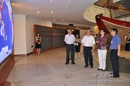 在博物館序廳,李海峰看到毛澤東在60年前為海外僑胞題寫的“僑胞們團(tuán)結(jié)起來,擁護(hù)祖國的革命,改善自己的地位”題詞時,向館長王明惠了解毛主席題詞的時間和背景。在中庭看到粵籍華僑華人的世界分布圖后,就問起了粵籍華僑華人的人數(shù),吳銳成、林琳解答說有三千多萬。李海峰指出廣東的確是僑務(wù)大省。李海峰接著來到李炳源捐贈文物及館藏字畫展廳,充分肯定美國華僑李炳源在海外收購中國文物并捐贈給廣東華僑博物館的愛鄉(xiāng)之情。接著李海峰仔細(xì)參觀了“廣東華僑歷史陳列”主題展,認(rèn)為這個展覽全面、系統(tǒng),陳展的實(shí)物和圖片、文獻(xiàn)資料都非常珍貴,其中很多圖片都是沒有見過的。