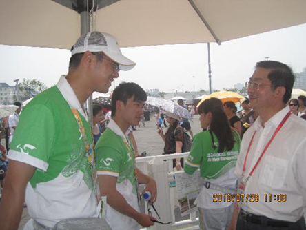 上午10時許,崔明華在世博園區(qū)志愿者部負責人的陪同下,看望了在中國館區(qū)域提供服務的華僑華人世博志愿者,并與他們親切交談。他仔細詢問了志愿者的工作狀況、身體情況以及為游客服務的事項,叮囑他們在高溫下要照顧好自己的身體,更好地服務于游客。