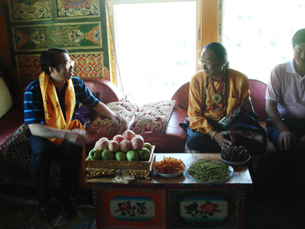 許又聲還與歸僑僑眷益西多吉、他洛、扎西澤仁進(jìn)行座談交流。益西多吉:境外藏胞眷屬,現(xiàn)甘孜縣政協(xié)委員,個(gè)人辦有一家藏醫(yī)院,從事藏醫(yī)。其子益西絨波(又叫向巴喇嘛),現(xiàn)在瑞士然燈寺任管家;其女卓瑪青措,在瑞士結(jié)婚并育有四個(gè)子女。他洛:回國(guó)定居藏胞,1959年去印度,1983年回國(guó)定居務(wù)農(nóng),現(xiàn)任甘孜縣政協(xié)委員。扎西澤仁:滯留藏胞。1959年去印度,從事小型商業(yè)活動(dòng)。2003年回家探訪侄兒生龍尼瑪,因病滯留至今。