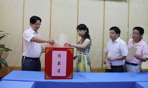 安徽省僑聯(lián)領(lǐng)導(dǎo)康曉萍、吳向明、王萬祥與機(jī)關(guān)干部職工一起慷慨解囊,奉獻(xiàn)愛心。(谷新)