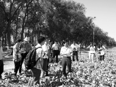 9月4日,參加“文化中國(guó)——海外華文媒體新疆行”的媒體代表到石河子采訪。石河子市外僑辦主任高輿陶(中)向媒體團(tuán)成員介紹當(dāng)?shù)胤N植棉花的情況。“文化中國(guó)——海外華文媒體新疆行”采訪活動(dòng)由中國(guó)國(guó)務(wù)院僑辦和新疆維吾爾自治區(qū)僑辦主辦,有來(lái)自美國(guó)、加拿大、法國(guó)等23個(gè)國(guó)家和地區(qū)的40家華文報(bào)紙、雜志、電視臺(tái)參加。(張紅攝)
