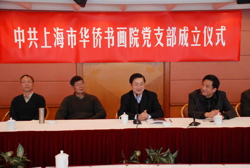 上海市僑辦主任、黨組書(shū)記崔明華出席并講話(huà)。他高度評(píng)價(jià)了華僑書(shū)畫(huà)院的書(shū)畫(huà)家們?cè)诤霌P(yáng)中華優(yōu)秀傳統(tǒng)文化、熱衷社會(huì)公益事業(yè)等方面作出的積極貢獻(xiàn),向加入書(shū)畫(huà)院黨組織的黨員書(shū)畫(huà)家們表示熱誠(chéng)地歡迎。