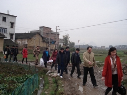 圖為廣西僑聯(lián)副主席劉漢祥一行踏著雨后的泥濘到蓮塘鎮(zhèn)龍雅村送溫暖、獻愛心