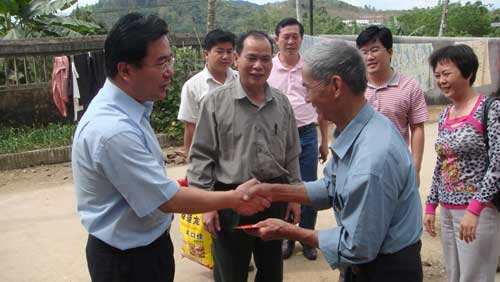 每到一戶,王勝都詢問他們家庭的生產(chǎn)生活情況及身體狀況,并送上慰問金和慰問品。瓊中和屯昌縣政府官員和當?shù)赝馐聝S務辦負責人陪同慰問。