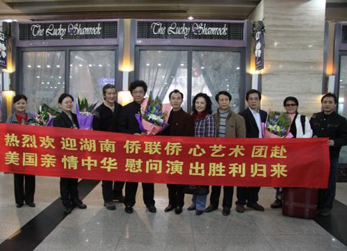 中新網(wǎng)2月11日電 據(jù)湖南省僑聯(lián)消息,經(jīng)湖南省政府批準(zhǔn),由湖南省僑聯(lián)組團(tuán),湖南省僑聯(lián)、長沙市外事僑務(wù)辦公室、長沙市僑聯(lián)、開福區(qū)僑聯(lián)主辦,應(yīng)美國有關(guān)僑(社)團(tuán)的邀請,湖南省僑聯(lián)僑心藝術(shù)團(tuán)于2010年1月23至2月8日,在紐約、洛杉磯、華盛頓、休斯敦、圣安東尼奧等城市“親情中華”赴美慰問巡演,圓滿成功,于2月9日載譽平安歸來。