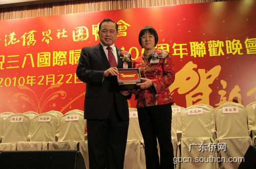 中新網(wǎng)2月26日電 據(jù)廣東僑網(wǎng)消息,2月22日晚,香港龍堡國(guó)際賓館冠蓋云集,群賢匯聚。香港僑界社團(tuán)聯(lián)會(huì)在此隆重舉行2010庚寅年春茗暨慶祝三八國(guó)際婦女節(jié)100周年聯(lián)歡晚會(huì)。廣東省僑辦副主任黎靜出席此次活動(dòng),并向該會(huì)贈(zèng)送禮品。
