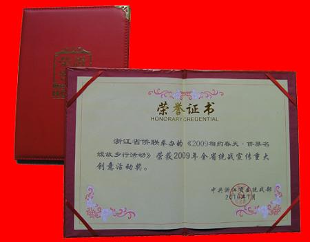 中新網(wǎng)3月1日電 據(jù)浙江僑聯(lián)網(wǎng)消息,辛勤耕耘終結(jié)碩果。年初捷報(bào)傳來:浙江省僑聯(lián)舉辦的“2009相約春天•僑界名媛故鄉(xiāng)行活動”榮獲2009年全省統(tǒng)戰(zhàn)宣傳重大創(chuàng)意活動獎(jiǎng)。