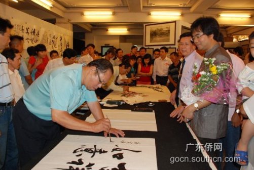 胡志明市華人書(shū)法協(xié)會(huì)會(huì)長(zhǎng)陳川先生在第5郡文化中心專(zhuān)門(mén)安排書(shū)法俱樂(lè)部成員與廣東禪武書(shū)法交流團(tuán)現(xiàn)場(chǎng)揮毫,互贈(zèng)作品,越中書(shū)畫(huà)家們?cè)谝还P一畫(huà)中展現(xiàn)越中友誼萬(wàn)古長(zhǎng)青。(小琴)