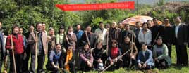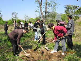 福建省僑聯(lián)副主席楊崢嶸、謝小建、福州市人大副主任陳樹雄、市政協(xié)副主席陳震宙、福州市僑聯(lián)黨組書記、主席藍桂蘭、福州市僑聯(lián)副主席、鼓樓區(qū)僑聯(lián)主席李盛玉、永泰縣僑聯(lián)黨支部書記汪秀錦等領(lǐng)導(dǎo)與青年委員和僑聯(lián)機關(guān)干部共同栽下近百株的桃樹和桂花樹,并細心地為每棵樹苗系上簽有自己名字的綠葉圖形標識,寓意僑聯(lián)事業(yè)與樹苗一同成長壯大、煥發(fā)生機活力。