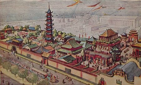 根據(jù)有關(guān)資料,“中國(guó)村”入口大門(mén)是一座巨大的牌坊,上面書(shū)寫(xiě)著“華商展覽場(chǎng)”幾個(gè)大字!爸袊(guó)村”內(nèi)設(shè)有兩個(gè)酒家、兩座戲院、一座神廟和一座七層高的佛塔!胺鹚侵袊(guó)村內(nèi)最高建筑!眴涛陌步榻B,“中國(guó)村”內(nèi)還建了一個(gè)陳列館和一二十家商店,分別展出中國(guó)的各類民間工藝品、瓷器、茶葉,還有少量具備科技含量的產(chǎn)品。