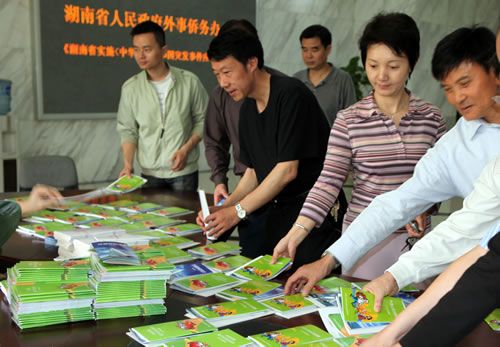 12日《實(shí)施辦法》集中宣傳日上,省外僑辦官員章定國(guó)、郝去吾、符華興、黎里溪、劉曉越、龐力平等人和全體干部職工及下屬單位代表70余人每人領(lǐng)取了一份《實(shí)施辦法》,并進(jìn)行了集中學(xué)習(xí)。