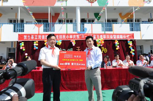 朱奕龍深情地說:和老師同學(xué)們一樣,每一個“六一”,既是你們最快樂的節(jié)日,也是我最高興、最幸福的日子。因為10年前,從銀帝集團(tuán)成立那天起,我就給自己定下了一個目標(biāo)——每年捐建2所希望小學(xué)。如今,10年過去了,我很榮幸并很負(fù)責(zé)任地向大家報告,已經(jīng)有60多所奕龍希望小學(xué)扎根全國、全區(qū)各地,我相信不久的將來,還有更多的希望小學(xué)矗立在寧夏山川。2003年,我在黃河岸邊捐建了民樂奕龍小學(xué),吸引了社會上更多關(guān)注教育、關(guān)注孩子們的眼光,更多的教育資金投向了這里。同時,看到一批批學(xué)生從這里走進(jìn)了更高的學(xué)府,我是多么的高興啊!2008年政治局委員、國務(wù)委員劉延?xùn)|在教育部部長周濟(jì)、自治區(qū)黨委書記陳建國、自治區(qū)人民政府主席王正偉等領(lǐng)導(dǎo)視察了民樂奕龍僑心希望小學(xué),對我也是極大的鼓舞。聽說今年4月,民樂奕龍在“寧夏希望工程20年”典型表彰活動中,又連獲“模范希望小學(xué)”、“希望工程優(yōu)秀教師”、“希望之星”三項提名獎,我為廣大老師和學(xué)校取得的榮譽(yù)感到非常的高興,為你們?nèi)〉玫某煽兏械綗o比的驕傲和自豪。今天看著學(xué)校優(yōu)良的設(shè)施建設(shè),優(yōu)美的教學(xué)環(huán)境,我深感欣慰,更為默默無聞、辛勤工作、無私奉獻(xiàn)的教師們感到敬佩。你們長期為了教育事業(yè)工作在鄉(xiāng)村,對艱苦的生活環(huán)境和生活狀況無怨無悔,令我非常感動。