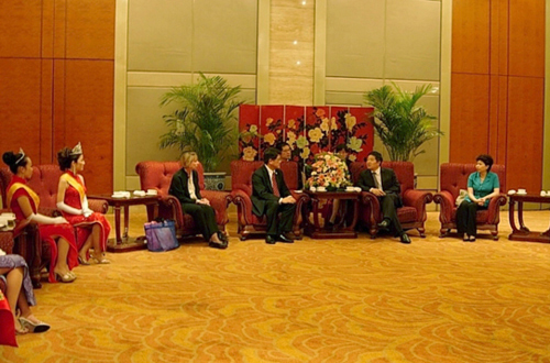 中新網(wǎng)6月23日電 據(jù)國僑辦網(wǎng)站消息,6月17日晚,國務(wù)院僑辦副主任任啟亮在北京新世紀(jì)飯店會見并宴請了由夏威夷中華總商會主席劉廣義率領(lǐng)的“第六十一屆水仙花皇后友好訪問團(tuán)”全體成員。