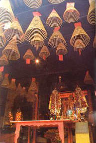 在澳門蓮峰廟中,香客將自己祈求的愿望寫(xiě)在紅紙上,系在盤香上。