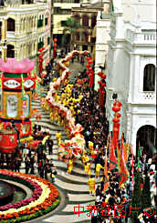 澳門十七日(農(nóng)歷年初二)舉行舞獅、舞龍賀新年活動(dòng)。由百余人舞動(dòng)的一百多米長(zhǎng)金龍行過(guò)街道,慶賀新年到來(lái)。