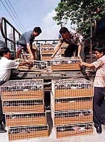 廣州舉行“信鴿競(jìng)翔報(bào)歸訊”活動(dòng) 作者:李懷德 象征1999年的1999只信鴿將于九月九日在澳門(mén)的大三巴牌坊前放飛返回廣州。這項(xiàng)名為“信鴿競(jìng)翔報(bào)歸訊”的活動(dòng),將揭開(kāi)九月十一日澳門(mén)回歸祖國(guó)倒計(jì)時(shí)一百天紀(jì)念活動(dòng)的序幕。圖為廣州市信鴿協(xié)會(huì)正將征集的信鴿運(yùn)往澳門(mén)。 |
