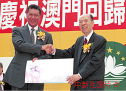 澳門各界慶祝回歸活動(dòng)委員會(huì)主席團(tuán)主席馬萬祺在澳門回歸倒計(jì)時(shí)五十天慶祝活動(dòng)中,向澳門特別行政區(qū)首任行政長(zhǎng)官何厚鏵贈(zèng)送"倒計(jì)時(shí)五十天紀(jì)念封"。