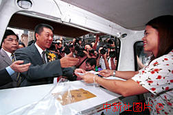 澳門特別行政區(qū)首任行政長(zhǎng)官何厚鏵三十一日在街頭郵政車前,為澳門回歸倒計(jì)時(shí)五十天紀(jì)念郵封加蓋郵戳。