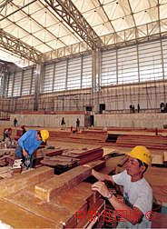 澳門政權(quán)移交大典場館內(nèi)部工程進行中,施工人員正在裝飾主席臺與觀禮臺。