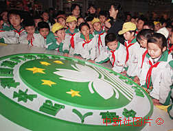 "世紀(jì)龍騰慶回歸"喜迎澳門回歸大型展覽,十二日在北京中國革命博物館開幕,北京的小學(xué)生認(rèn)真聽講解員講述澳門的歷史和特區(qū)區(qū)徽。