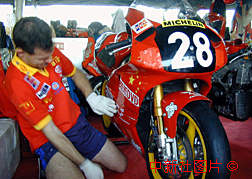 第四十六屆澳門格蘭披士大賽車即將開(kāi)始,一支代表中國(guó)某集團(tuán)公司出賽的摩托車隊(duì)正在進(jìn)行車輛的賽前調(diào)試。