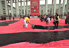 曾獲吉尼斯世界紀(jì)錄的中國巨書書法家孫鑫,二十三日在北京天安門廣場澳門倒計(jì)時(shí)牌前,用巨筆書寫一個(gè)九百九十九平方米的巨大“龍”字,該作品將運(yùn)往澳門展出。作者:宗金柱