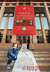 北京十三歲的少女劉莉為迎接澳門回歸創(chuàng)作的國畫《世紀(jì)龍游圖》巨作,近日被載入世界吉尼斯紀(jì)錄。該畫總長九十九點九米,代表一九九九年,畫中的兩千只蝦則表示迎接2000年的到來。這是劉莉在北京歷史博物館的澳門倒計時牌前展示自己的《世紀(jì)龍游圖》。