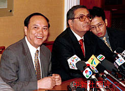廣東省公安廳長陳紹基(左)與澳門保安政務司孟明智,七日在澳門出席第三十三次粵澳治安會晤后舉行記者會,陳紹基表示確信澳門警方有能力做好澳門回歸其間的治安保衛(wèi)工作。 中新社傳真 毛建軍 攝