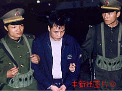 廣東省佛山市公安局經(jīng)過一年的偵查,搗毀了一個(gè)粵澳黑社會(huì)組織相互勾結(jié)開賭放數(shù)、追債勒索的犯罪團(tuán)伙,抓獲涉案人員二十八名,繳獲槍支彈藥一批。圖為犯罪團(tuán)伙頭目曾啟強(qiáng)(中)被警方抓獲。