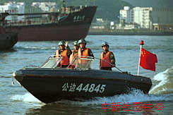 在澳門與珠海一衣帶水的內(nèi)河上,巡羅的中國(guó)武警快艇官兵向澳門游船上的中外客人招手致敬。
