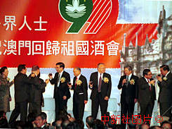 香港各界十八個(gè)團(tuán)體十五日在會(huì)議展覽中心舉行盛大酒會(huì),特首董建華、外交部駐港特派員公署特派員馬毓真、新華社香港分社社長(zhǎng)姜恩柱等嘉賓舉杯相互祝賀回歸澳門(mén)祖國(guó)。 中新社傳真洪少葵攝