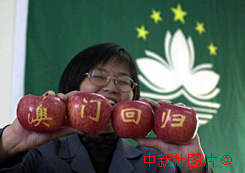 產(chǎn)自陜西黃土高原的延安蘋果,被映上 慶祝澳門回歸字樣作為禮品送抵澳門。中新社數(shù)碼傳真 王瑤攝