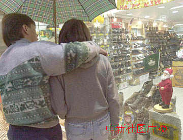 澳門一家商店特意讓圣誕老人玩具手握特區(qū)區(qū)旗歡迎回歸,引起一對(duì)情侶的好奇。