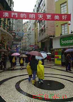 澳門板樟堂街鬧市懸掛醒目標(biāo)語,表達(dá)出市民對(duì)回歸后的信心。中新社數(shù)碼傳真 賈國榮攝