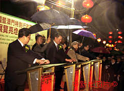 全國政協(xié)副主席馬萬祺、澳門首任行政長官何厚鏵、新華社澳門分社社長王啟人十六日晚共同為慶回歸燈展主持亮燈儀式。中新社數(shù)碼傳真 賈國榮攝