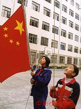 上海東風中學虞維詩(右)是澳門籍學生,在澳門回歸前的這一個星期中,學校特地將每天清晨升國旗的任務交給她。圖為虞維詩17日與同學一起升國旗的情景。