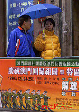 澳門民間的慶回歸活動陸續(xù)展開,預(yù)告解放軍歌舞團(tuán)演出的海報(bào)出現(xiàn)在大街小巷。中新社傳真 宗金柱 攝