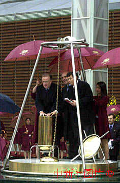 葡萄牙總統(tǒng)沈拜奧(左一)、澳門總督韋奇立(左二)十八日將一只裝有澳門回歸有關(guān)文件的時(shí)間囊封閉。這個(gè)時(shí)間囊將在澳門回歸移交大典場(chǎng)館前的地下封存五十年。中新社數(shù)碼傳真 毛建軍攝