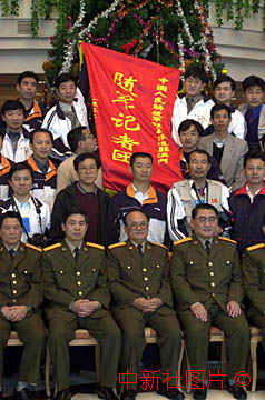 中國人民解放軍進(jìn)駐澳門部隊(duì)隨軍記者團(tuán)18日在珠海成立,廣州軍區(qū),總政治部,駐澳部隊(duì)領(lǐng)導(dǎo)與中外記者合影。中新社數(shù)碼傳真 王瑤攝